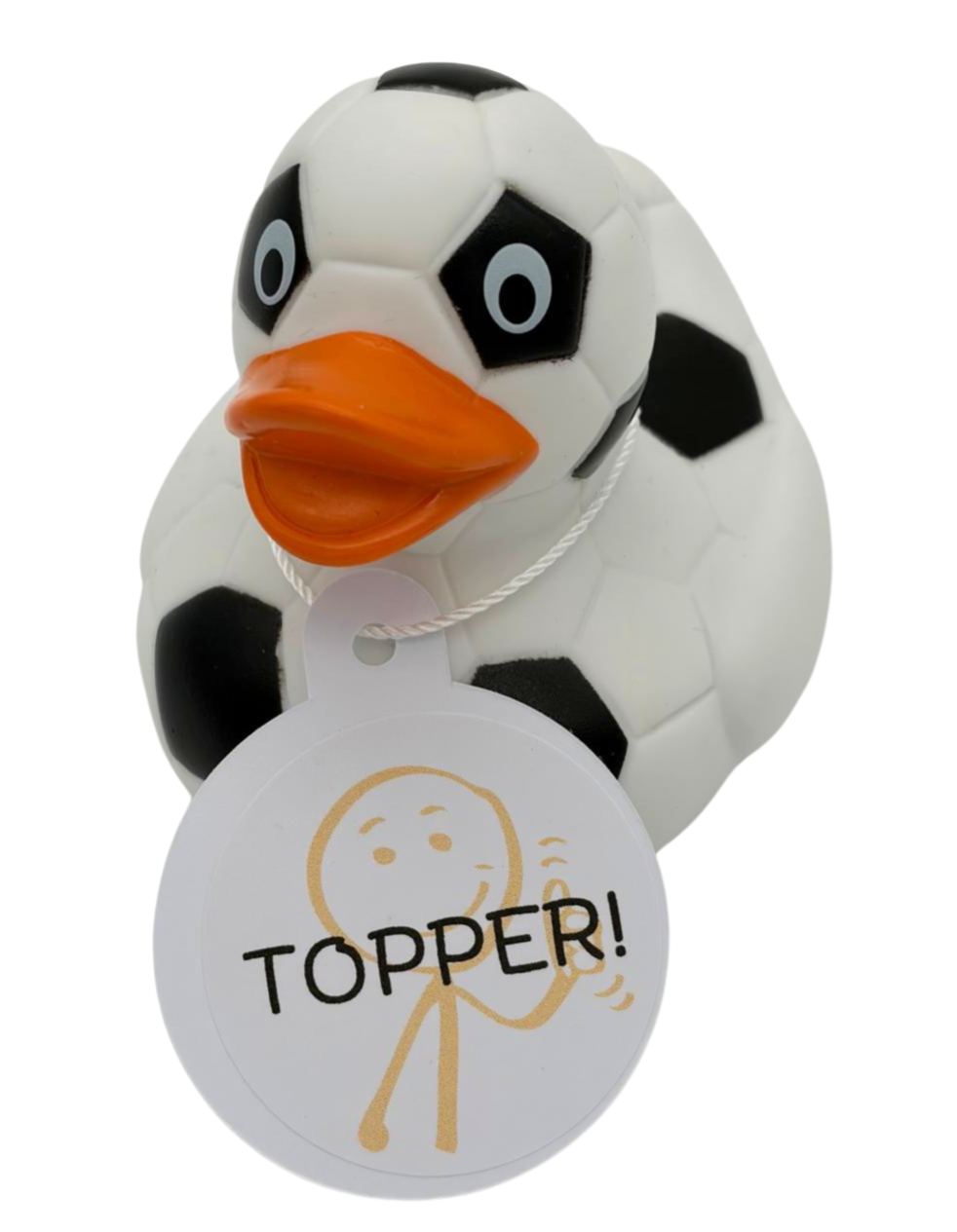 Dit sportieve badeendje is klaar om te scoren! Met zijn stoere voetbaldesign en een kaartje om zijn nek met de krachtige slogan "Topper!", is dit het perfecte cadeautje voor elke voetbalfan of teamplayer. Of je nu een doorgewinterde spits bent, een fanatieke coach of gewoon dol bent op het spel – dit eendje motiveert om altijd voor de winst te gaan!