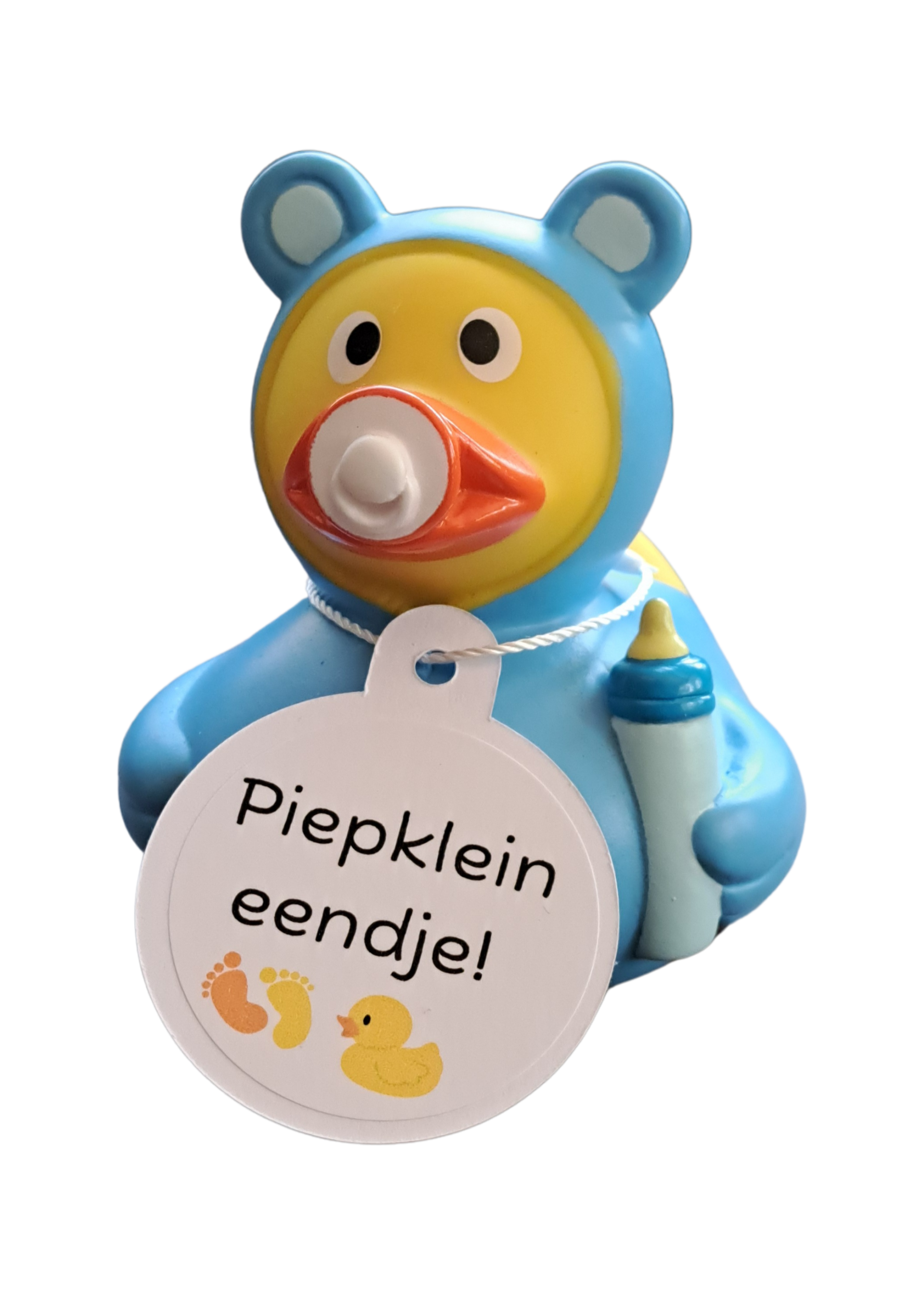 Dit schattige badeendje is net zo lief en klein als een pasgeboren baby! Met een speentje in zijn snavel en een kaartje om zijn nek met de tekst "Piepklein eendje", is dit het perfecte cadeautje voor een kersverse baby of als vrolijke verrassing bij een geboorte.