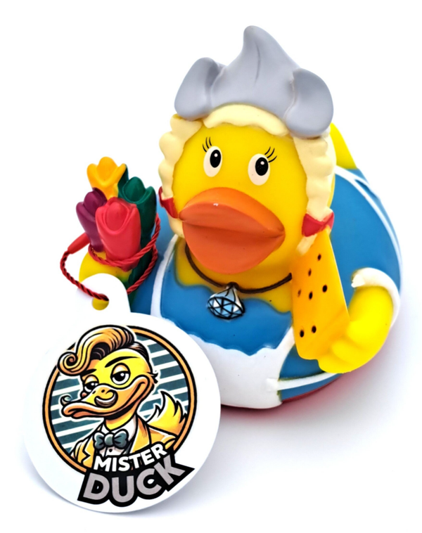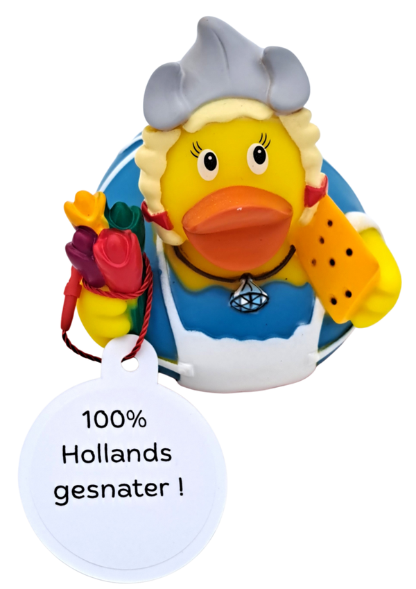 Zeeuws kapje op, bosje tulpen en een blok kaas onder de vleugel: dit eendje is 100% Holland in eendenvorm. ๐ง๐ท๐ช