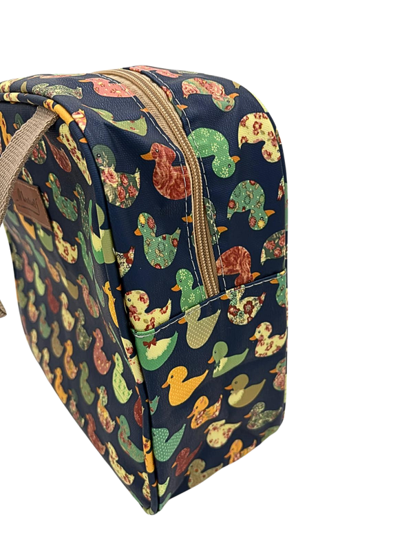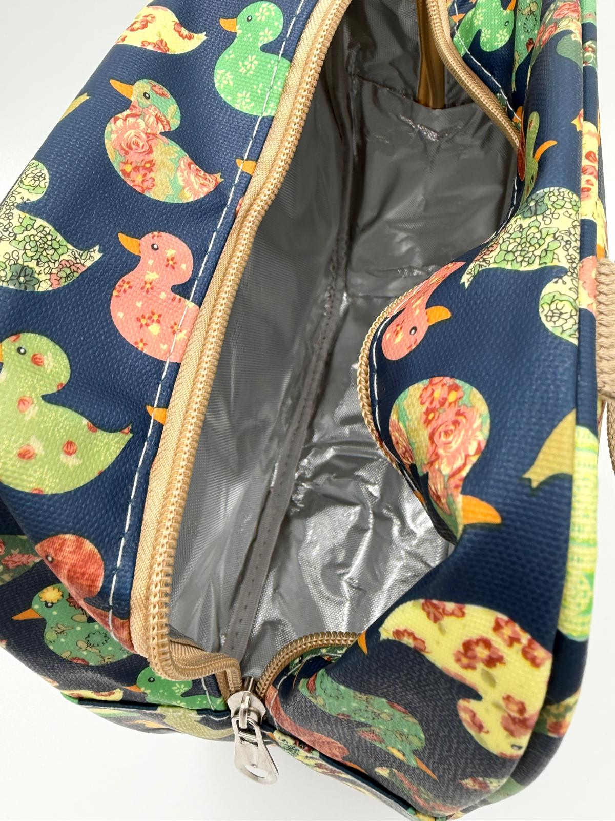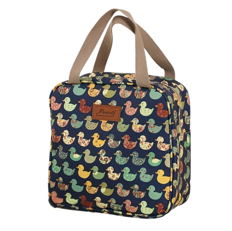 Het speelse design met kleurrijke eendjes geeft de tas een unieke, vintage uitstraling die zowel jong als oud aanspreekt. Maar het is niet alleen het uiterlijk dat telt: dankzij de hoogwaardige thermische voering is de tas verrassend functioneel. De binnenzijde werkt als een natuurlijke isolatielaag die de inhoud perfect op temperatuur houdt.
